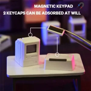 The set includes two intricately designed keycaps: a tiny monitor meant for the ESC key (1u) and an accompanying “desk/keyboard” for the Tab key (1.5u). The monitor keycap features a translucent, glowing faceplate design. When placed over a backlit or RGB switch, the light shines directly through the “screen” of the miniature Macintosh, creating a stunning glowing display effect. Some versions even allow you to swap out the tiny display cards to change the monitor’s background.